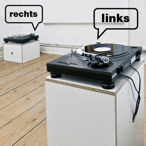 A little loop-installation-work LINKS-RECHTS. Two turntables, two loop-records with one loop each and active-loudspeakers. > Linda gallery Hamburg |